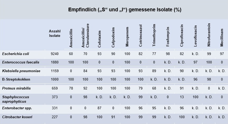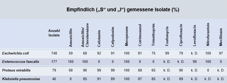Die Kenntnis der lokalen Resistenzsituation ist für die Wahl einer effektiven empirischen Antibiotikatherapie von entscheidender Bedeutung. Grundlage der vorliegenden Resistenzstatistik sind Urinuntersuchungen von ambulanten Patientinnen und Patienten, getrennt nach Erwachsenen (Tabelle 2) und Kindern (Tabelle 3). Die „I“-Kategorie (= sensibel bei erhöhter Exposition) wird in dieser Resistenzstatistik zu den empfindlichen Isolaten gezählt, da bei hoher Dosierung oder durch Anreicherung des Antibiotikums am Infektionsort, etwa durch eine hohe Konzentration im Urin, mit einer Wirksamkeit der Substanz gerechnet werden kann. Da es seitens des Europäischen Komitees zur Antimikrobiellen Empfindlichkeitstestung (EUCAST) keine standardisierten Vorgaben zur Bestimmung der Empfindlichkeit für alle Erreger-Antibiotika-Kombinationen gibt, kann nicht für alle Substanzen eine Resistenzbestimmung erfolgen. Dies liegt an noch fehlenden klinischen Daten zur Wirksamkeit bestimmter Substanzen oder an einer natürlichen (intrinsischen) Resistenz einiger Erreger.