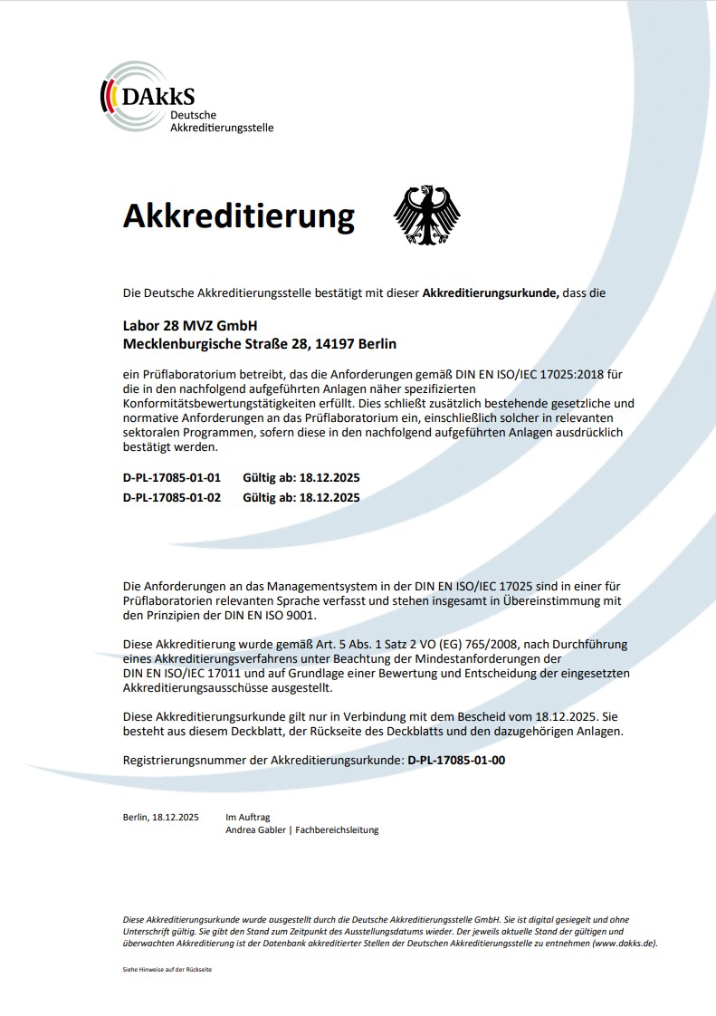Seit 2001 ist das Labor 28 nach der DIN EN ISO 17025 durch die Deutsche Akkreditierungsstelle (DAkkS) akkreditiert. Seit 2005 besteht die Akkreditierung nach der DIN EN ISO 15189 für medizinische Laboratorien und für Trinkwasser und Hygieneuntersuchungen nach der DIN EN ISO 17025.