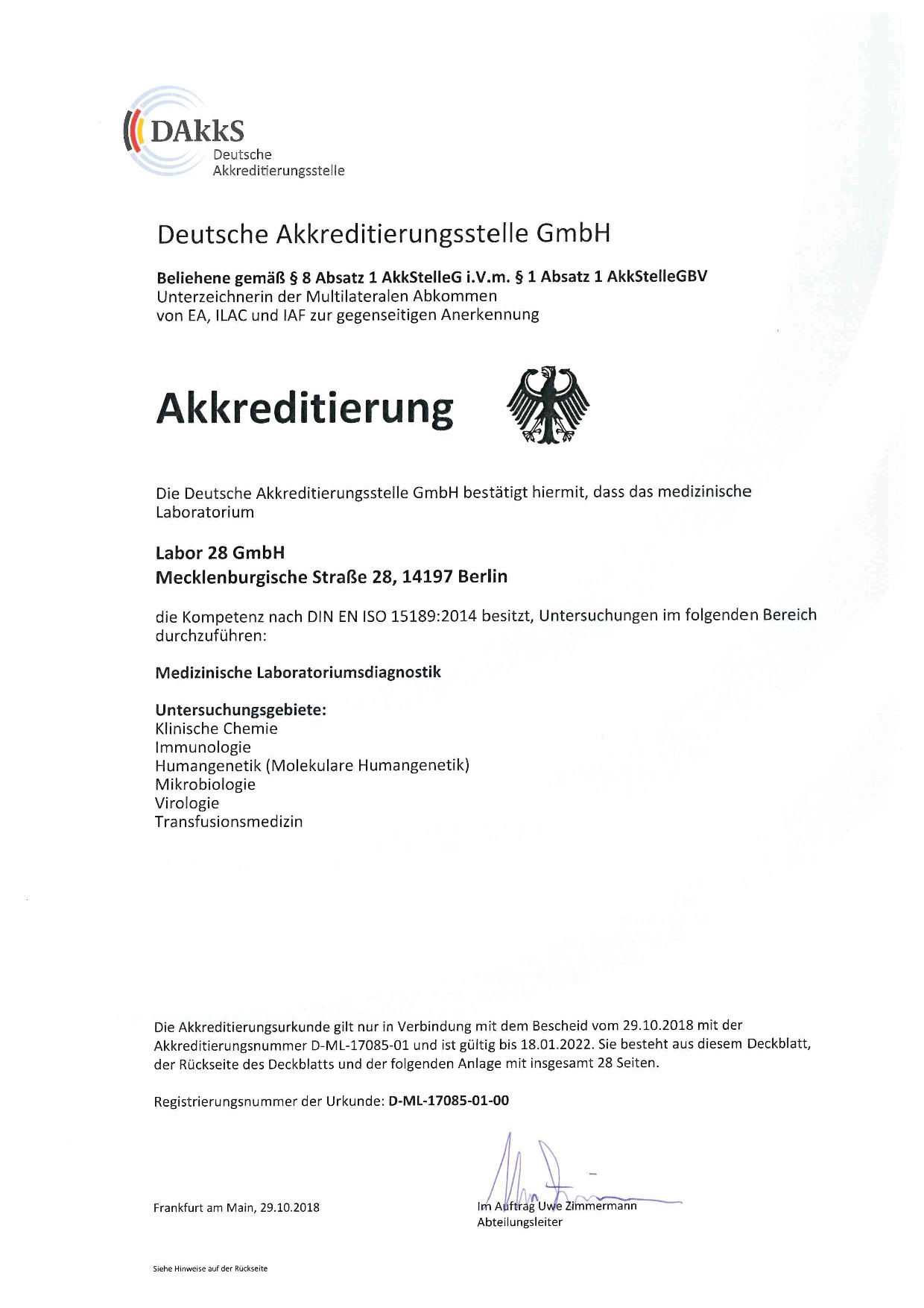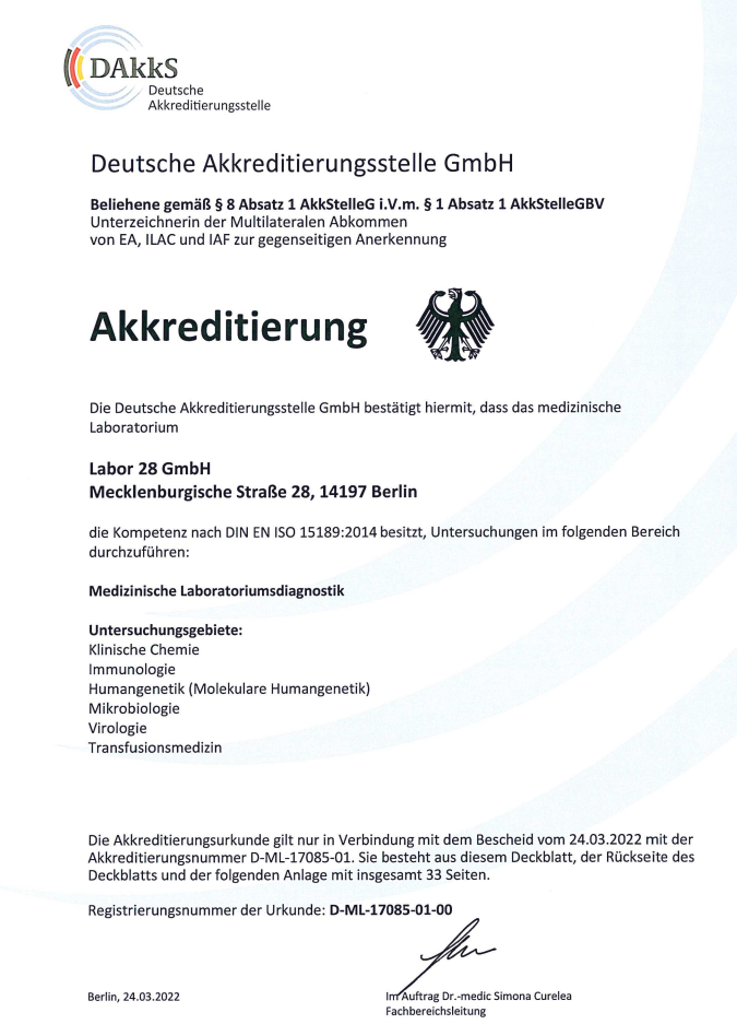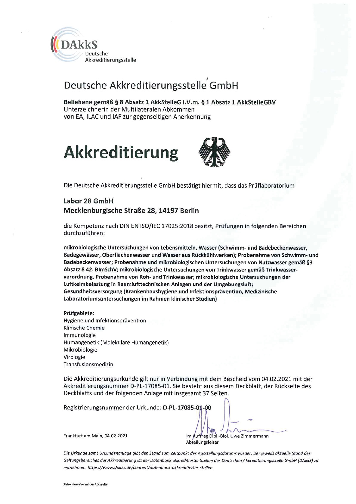 Seit 2001 ist das Labor 28 nach der DIN EN ISO 17025 durch die Deutsche Akkreditierungsstelle (DAkkS) akkreditiert. Seit 2005 besteht die Akkreditierung nach der DIN EN ISO 15189 für medizinische Laboratorien und für Trinkwasser und Hygieneuntersuchungen nach der DIN EN ISO 17025.