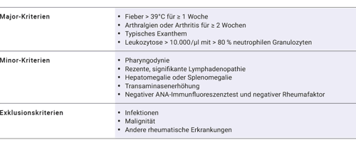 Sind die sog. Yamaguchi-Klassifikationskriterien (siehe Tab. 1) erfüllt, unterstützt dies die klinische Diagnose eines AOSD (die Klassifikation als AOSD fordert ≥ 5 Kriterien, von denen 2 Major-Kriterien sein müssen).