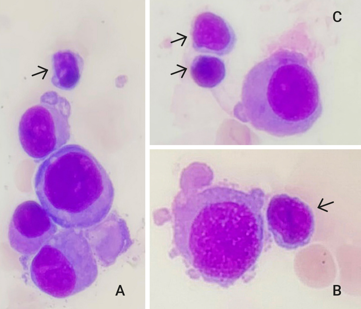Abbildung 3. Zellen mit morphologischen Malignitätskriterien neben unauffälligen Lymphozyten (Pfeile)