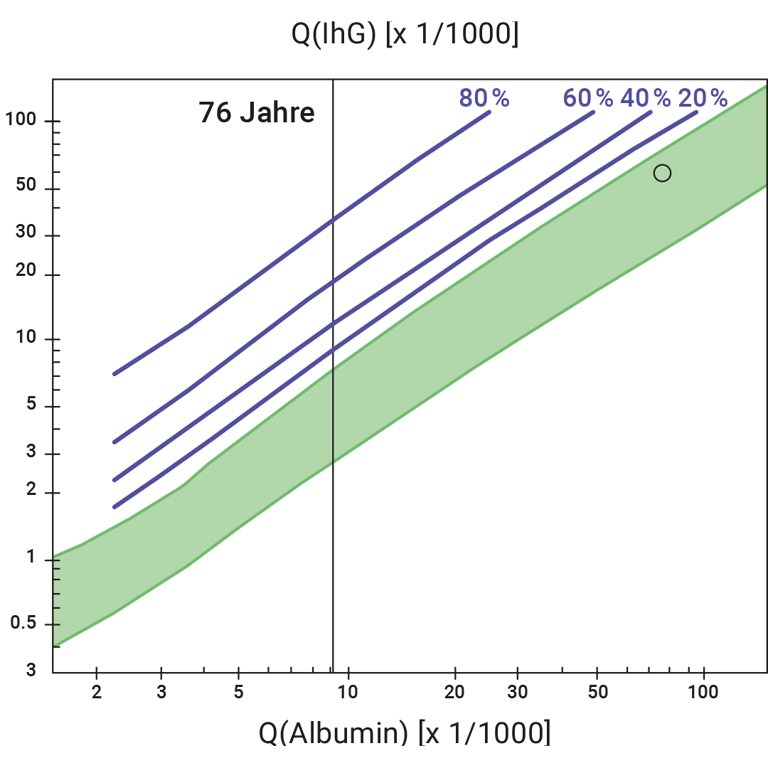 Abbildung 1. Reiber-Diagramm: Starke Schrankenstörung ohne intrathekale IgG-Synthese