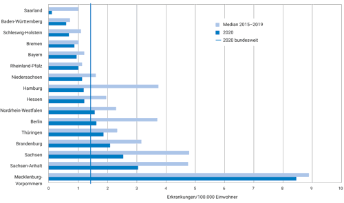 Abbildung 1. Übermittelte Kryptosporidiosen pro 100.000 Einwohner nach Bundesland, Deutschland, 2020 (n = 1.190) im Vergleich mit den Vorjahren.