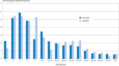 Die höchsten altersspezifischen Inzidenzen wurden bei 1- bis 9-jährigen Kindern gesehen (siehe Abb. 2). Diese Altersverteilung verdeutlicht, dass die häufige Annahme, dass Kryptosporidien vor allem immungeschwächte Patienten infizieren, nicht zutrifft. Sowohl bei Kindern als auch bei Erwachsenen waren Mädchen bzw. Frauen häufiger infiziert als Jungen bzw. Männer, wobei vor allem bei Erwachsenen von einer deutlichen Untererfassung auszugehen ist. Die meisten Kryptosporidiosen werden in Deutschland erworben. Es kommen jedoch auch reiseassoziierte Infektionen vor, deren Anteil an der Gesamtzahl der Infektionen im Jahr 2020 allerdings pandemiebedingt vergleichsweise gering war.