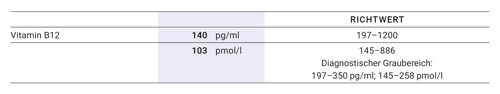 Differenzialdiagnostisch kamen hier vor allem eine akute Leukämie, eine toxische Ursache und ein Substratmangel in Frage. Eine akute Leukämie konnte mittels eines manuellen Differenzialblutbildes ausgeschlossen werden, da mikroskopisch keine Blasten zu sehen waren. Anamnestisch gab es des Weiteren keinen Hinweis auf eine toxische Genese der Blutbildveränderungen. Die Patientin berichtete bei weiteren Nachfragen, dass sie sich seit Jahren vegetarisch ernähren würde. Daraufhin erfolgte eine Vitamin B12-Bestimmung, die einen deutlich erniedrigten Wert ergab (s. Abb. 2). Nach Substitution von Vitamin B12 normalisierten sich die Blutbildbefunde im Verlauf.