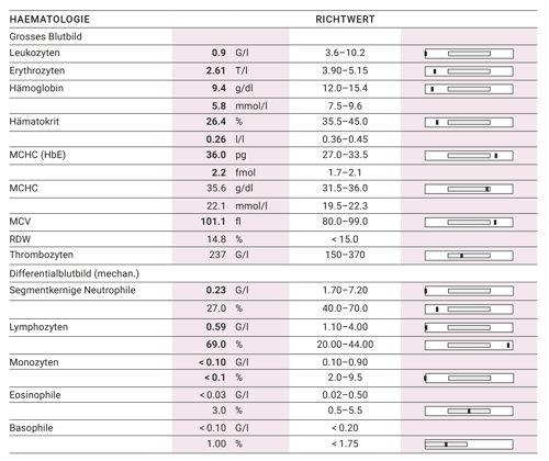Labordiagnostisch wurde zunächst ein großes Blutbild bestimmt (s. Abb. 1). Dabei zeigte sich eine Bizytopenie: eine Leukopenie mit einer schweren Neutropenie von 0,23 G/l (RW: 1,7–7,2) und eine makrozytäre, hyperchrome Anämie von 9,4 g/dl (RW: 12,0–15,4).