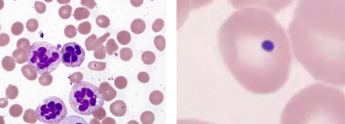Abbildung 3. Manuelles Differenzialblutbild: Hypersegmetierte Granulozyten (links), Jolly-Körperchen (rechts)