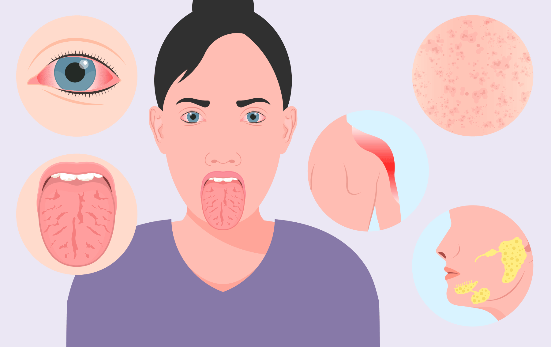Sicca-Symptome machen die häufigste Manifestation des Sjögren-Syndroms aus. Die chronische Funktionsstörung der exokrinen Drüsen führt regelmäßig zu Xerophthalmie (Augentrockenheit) mit Fremdkörpergefühl, Brennen sowie erhöhter Lichtempfindlichkeit und zu Xerostomie (Mundtrockenheit) beim längeren Sprechen und Einspeicheln trockener Lebensmittel. Infektionen der Mundhöhle (insbesondere mit Candida albicans), Mundgeruch, Parodontose, Schluckbeschwerden mit Heiserkeit, Atemwegsinfekte sowie Geschmacks- und Geruchsstörungen sind ebenfalls typisch.