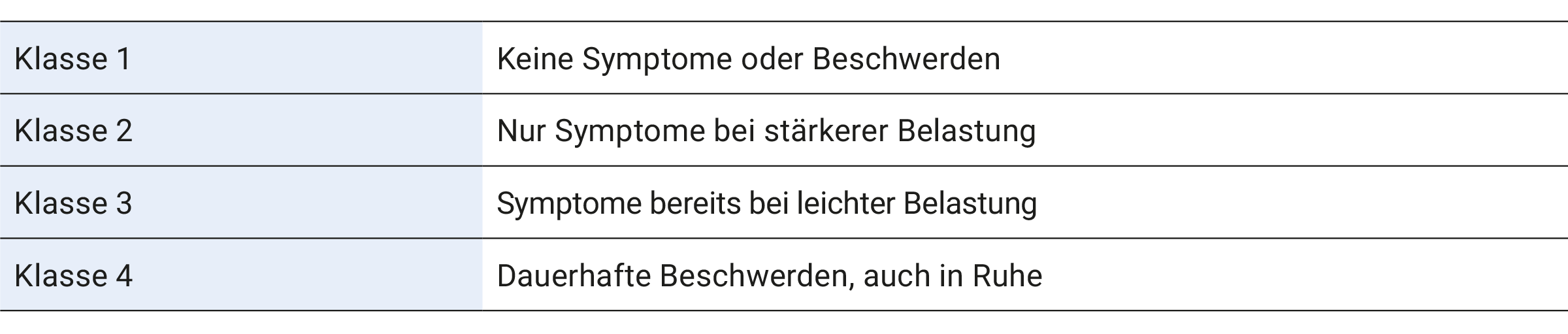 Die HOCM wird nach der New York Heart Association-Klassifikation für Herzkrankheiten in vier Klassen eingeteilt(siehe Tabelle 1).