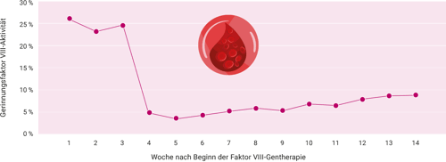 Die Gentherapie erfolgt in entsprechend zertifizierten Hämopholiezentren in Deutschland bisher nur bei einigen Patienten. Im Labor 28 konnten wir nun erstmalig den Verlauf des Gerinnungsfaktor VIII-Aktivitätsanstiegs nach einer erfolgten Gentherapie im Rahmen einer schweren Hämophilie A mitverfolgen. Der Patient hatte in den ersten drei Wochen nach Beginn der Gentherapie noch Gerinnungsfaktor VIII erhalten (FVIII-Werte um ca. 25 %). In der vierten Woche wurde die Substitution abgesetzt. Ab der ca. fünften Woche konnte man dann labordiagnostisch einen leichten Anstieg des Gerinnungsfaktors VIII beobachten. Ein Anstieg der Transaminasen ist in den ersten Monaten nach erfolgter Gentherapie nicht aufgetreten.