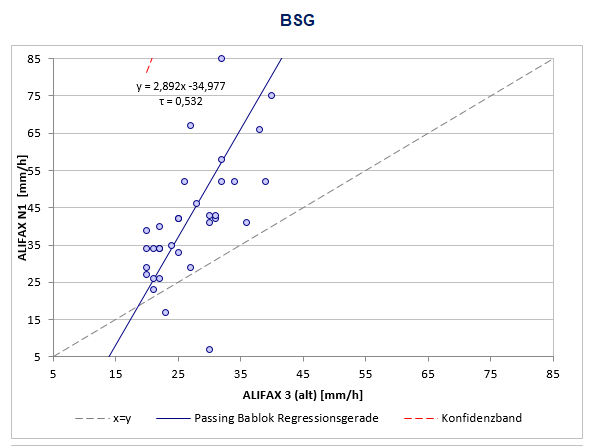 Unsere Validation konnte zeigen, dass insbesondere außerhalb des Referenzbereichs (Frauen >= 25 mm/h, Männer >= 20 mm/h) höhere Werte (mittlere Abweichung bis zu 40 %) im Gegensatz zu den Vorgänger-geräten (siehe Abbildung) gemessen werden. Wie vom Hersteller angegeben, korrelieren diese höheren Werte besser mit der klassischen Westergren-Methode.
