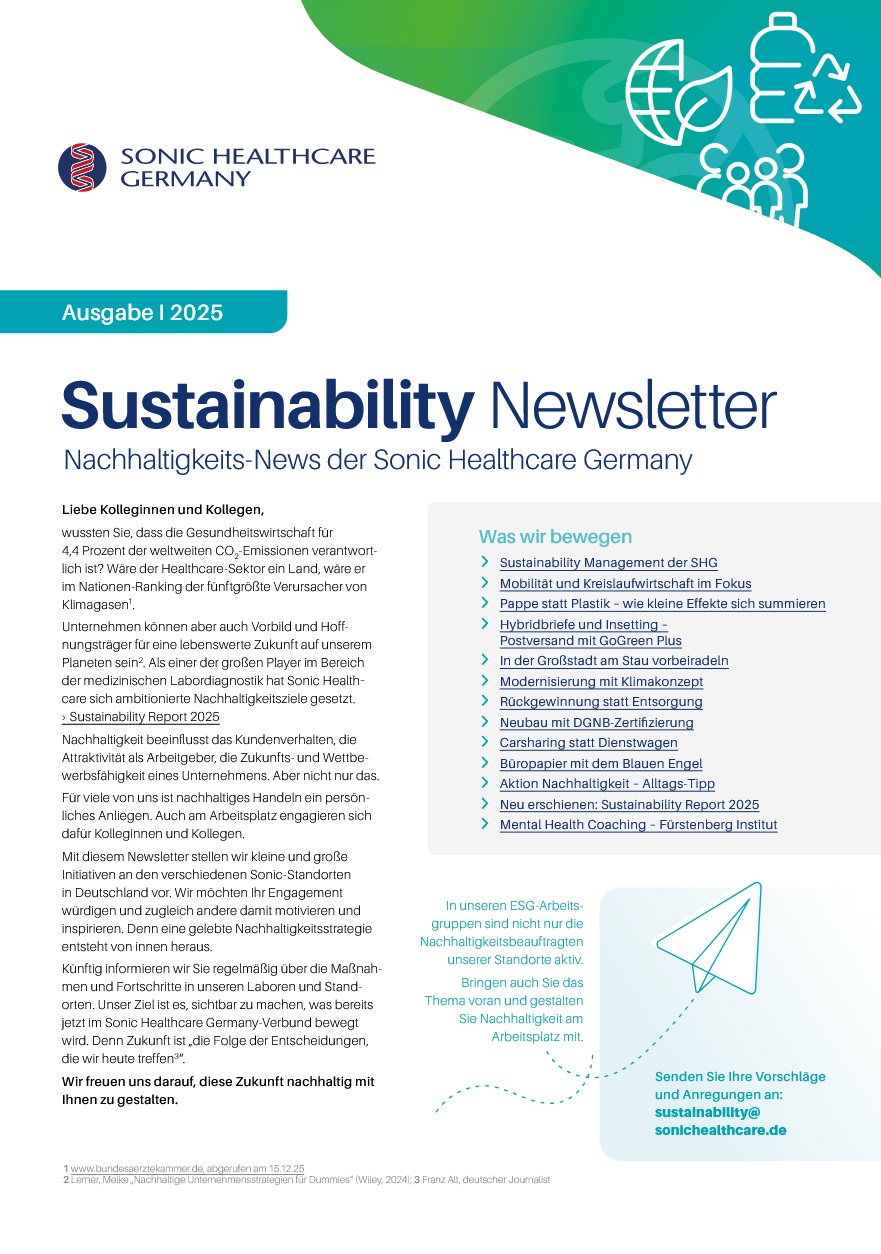 Mit dem Sustainability Newsletter von Sonic HealthCare erhalten Sie regelmäßig spannende Einblicke in aktuelle Projekte und konkrete Maßnahmen rund um Nachhaltigkeit, Verantwortung und Zukunftsgestaltung.